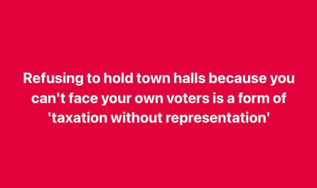 Hey, #Republicans, Refusing to hold town halls because you can’t face your own voters is a form of ‘taxation without representation’ So end the #GOP #cowardice and start doing the jobs we the people elected you, the public servant, to do!